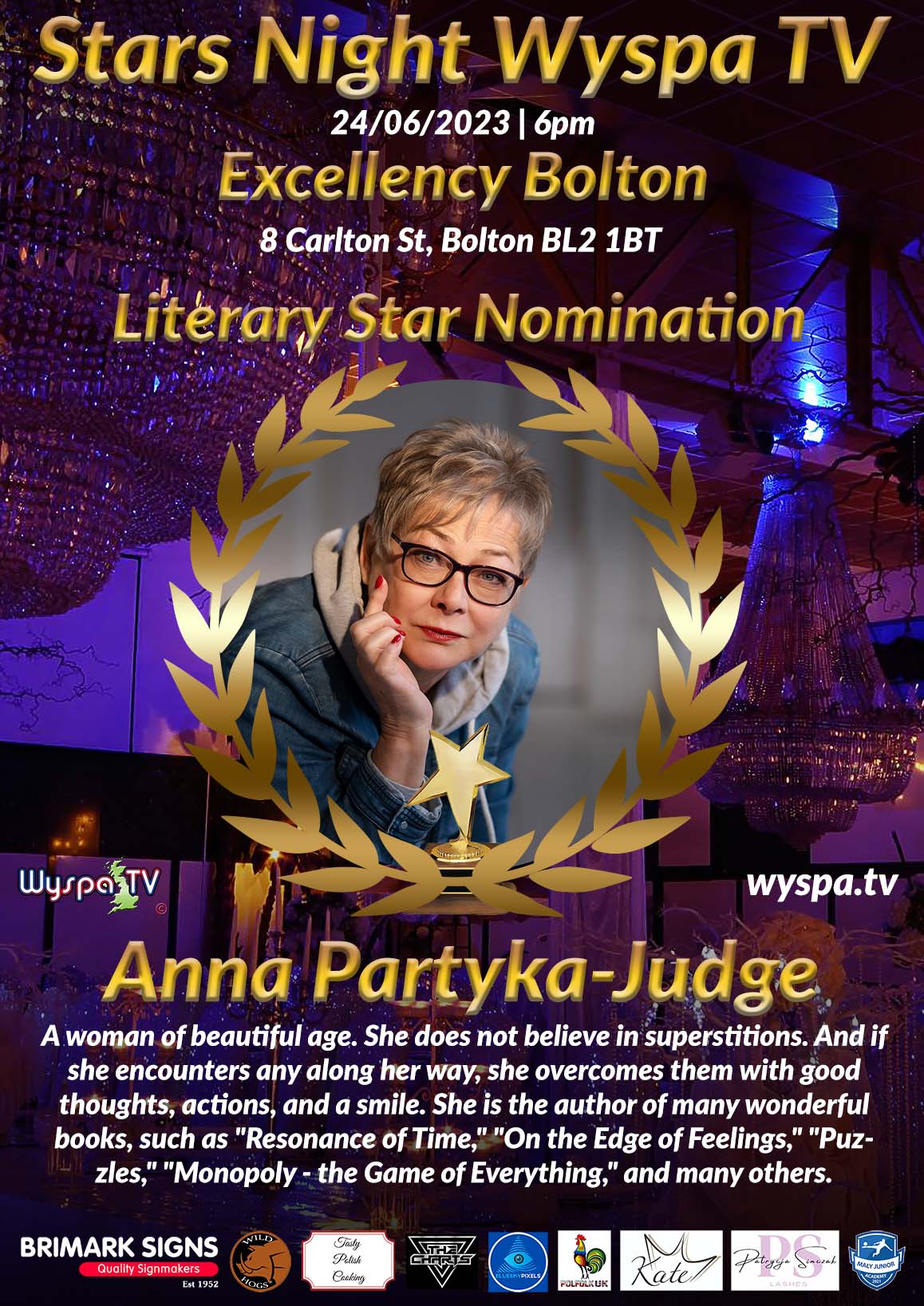 A woman of beautiful age. She does not believe in superstitions. And if she encounters any along her way, she overcomes them with good thoughts, actions, and a smile. Anna Partyka - Judge was born and raised in Świnoujście. She is a graduate of the Teacher Training College in Szczecin. She completed her studies at the Academy of Music in Poznań (Branch in Szczecin). Since 1988, she has been president of the "Na Wyspie" Literary Club for several years. She debuted her poetry in 1977 in the weekly magazine "Spojrzenia." Her poems were published on Polish Radio Szczecin and in the Szczecin press. Several of her works were featured in the almanack "In the Shadow of the Sea" (1980), "Inner Seas" (1997), "In the Warm Sand of Poetry" (2002), "Emotion Catchers" (2010), and "Poetry is in Us" (2012). She also published a collection of poems titled "I'll give you that much." (1999). Ania says that the adventure with poetry continues. However, life is not poetry but a tough art. And although she doesn't perform on the stage, she plays the leading role in her own life theatre. Music and poetry are still present in her life. They allow her to build a bridge between what hurts in life and what is reborn, inspired, and beautiful. Life energy has been filling Anna since the moment she was born. She infects others with positive thinking. She is a cheerful, sociable, and open person. Like everyone, she also has moments of doubt. Seemingly weak, yet strong enough to take on another life challenge. In the meantime, she published her own poetry collection, sang in the choirs of the Music Academy and the Medical Academy, gained experience on the musical theatre stage, and conducted an orchestra and choir at the Pomeranian Dukes' Castle. She is the author of many wonderful books, such as "Resonance of Time," "On the Edge of Feelings," "Puzzles," "Monopoly - the Game of Everything," and many others. Travelling abroad results in more energetic changes in her life. She records fantastic broadcasts, including for Wyspa TV, and greets her fans with a big red heart and a characteristic slogan: "Being a young writer...". Ania is simply wonderful.