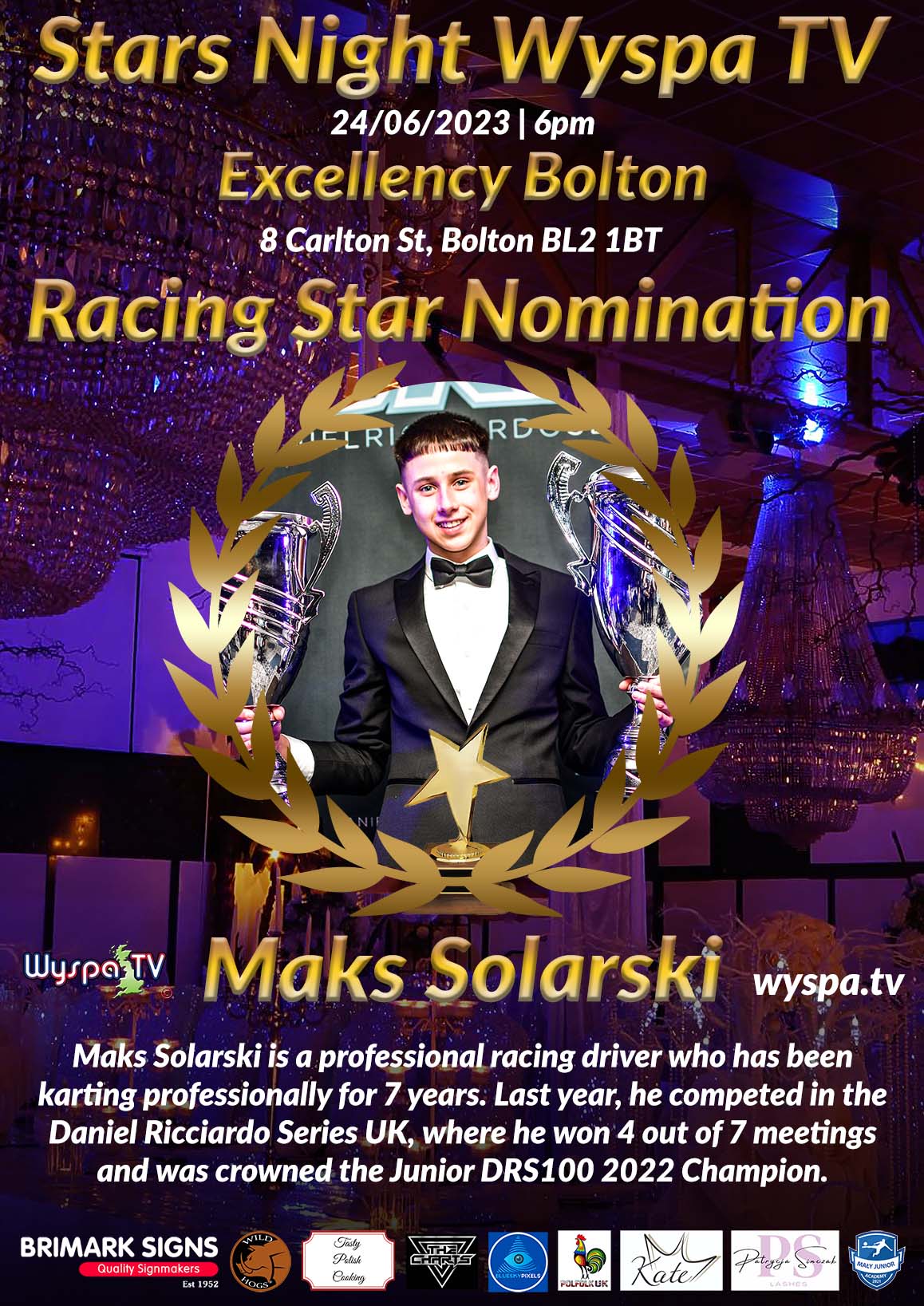 During the 2022 season, Maks achieved his biggest accomplishment in his sporting career at the EasyKart World Finals, where he finished on the lowest podium step. He also participated in the British 24h race, one of the year's biggest challenges. Maks spent nearly 3 hours behind the wheel during his night stint in rainy conditions for the first time in his life. After his pit stop, he handed over the kart to their team driver with a solid 1 lap lead. At the end of the 2022 season, Maks took part in the JamSport Racing scholarship, successfully advancing to Stage 2 and then progressing to the final. He performed well and became the 2023 JamSport Racing Scholar. These results demonstrate Maks' exceptional driving skills. Throughout his career, he has competed in numerous club and national championships, earning impressive results, leading him to accumulate over 125 trophies with many podiums and wins. This year, Maks will debut in the car racing world by participating in the BRSCC Fiesta Junior Championship, which also races alongside the TCR UK series.