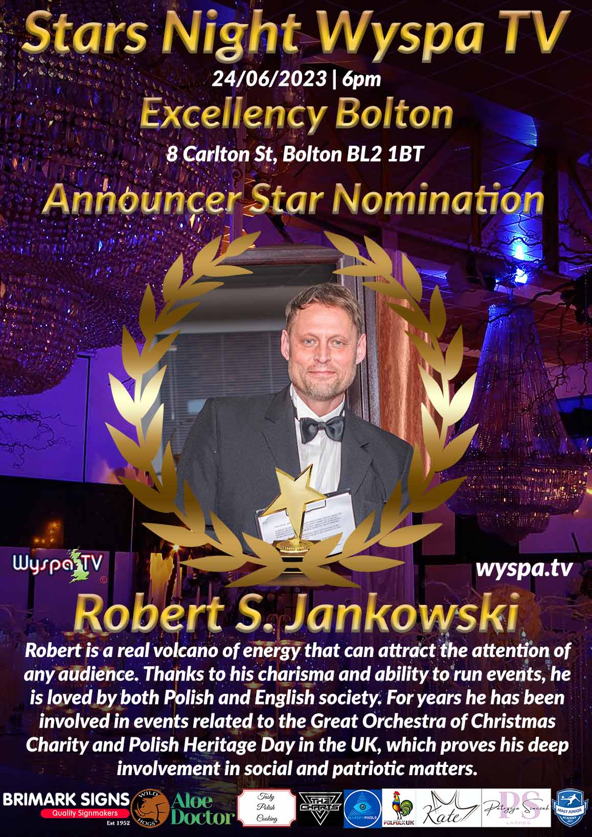 Robert is a real volcano of energy that can attract the attention of any audience. Thanks to his charisma and ability to run events, he is loved by both Polish and English society. For years he has been involved in events related to the Great Orchestra of Christmas Charity and Polish Heritage Day in the UK, which proves his deep involvement in social and patriotic matters.