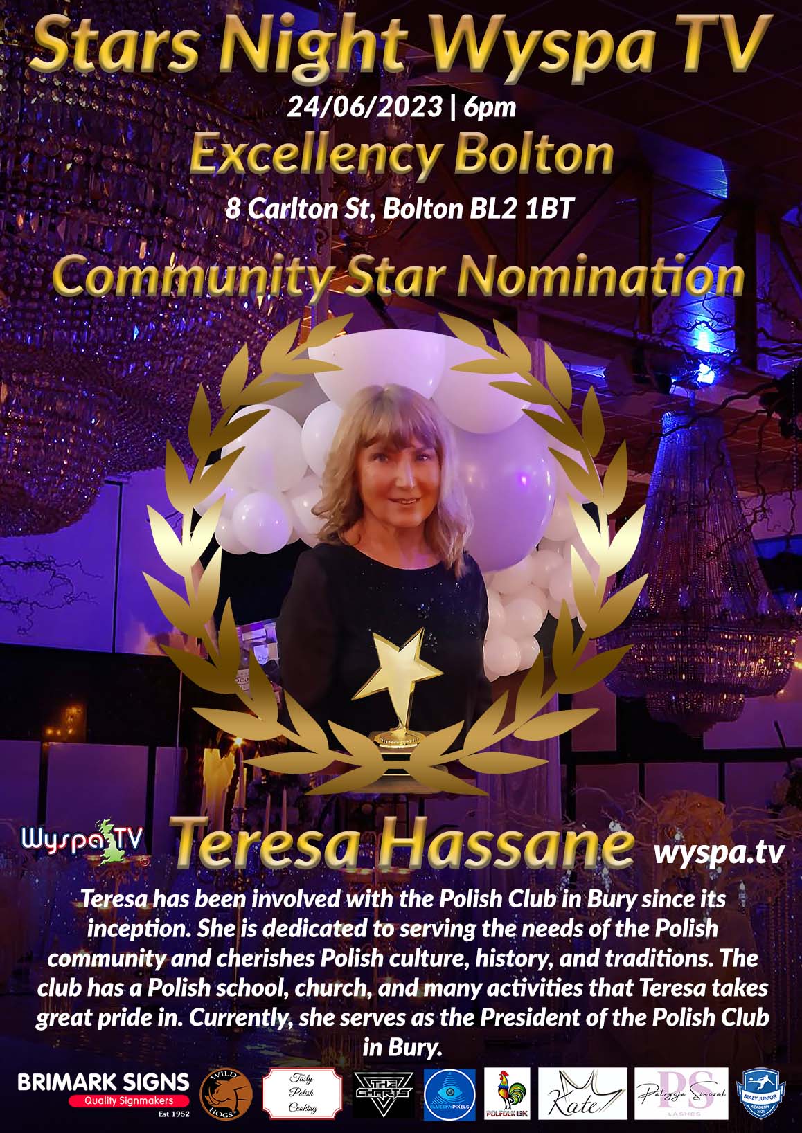 It is the last nomination for the prestigious STARS NIGHT WYSPA TV award in the "COMMUNITY STAR" category. We are convinced that this wonderful group of Poles deserves their nomination. It is a team of exceptional people led by two leaders, Urszula Dyrka and Aleksandra Zachara. They all stand out with their huge hearts and willingness to help, and they can also create amazing events that stay in memory for a long time.