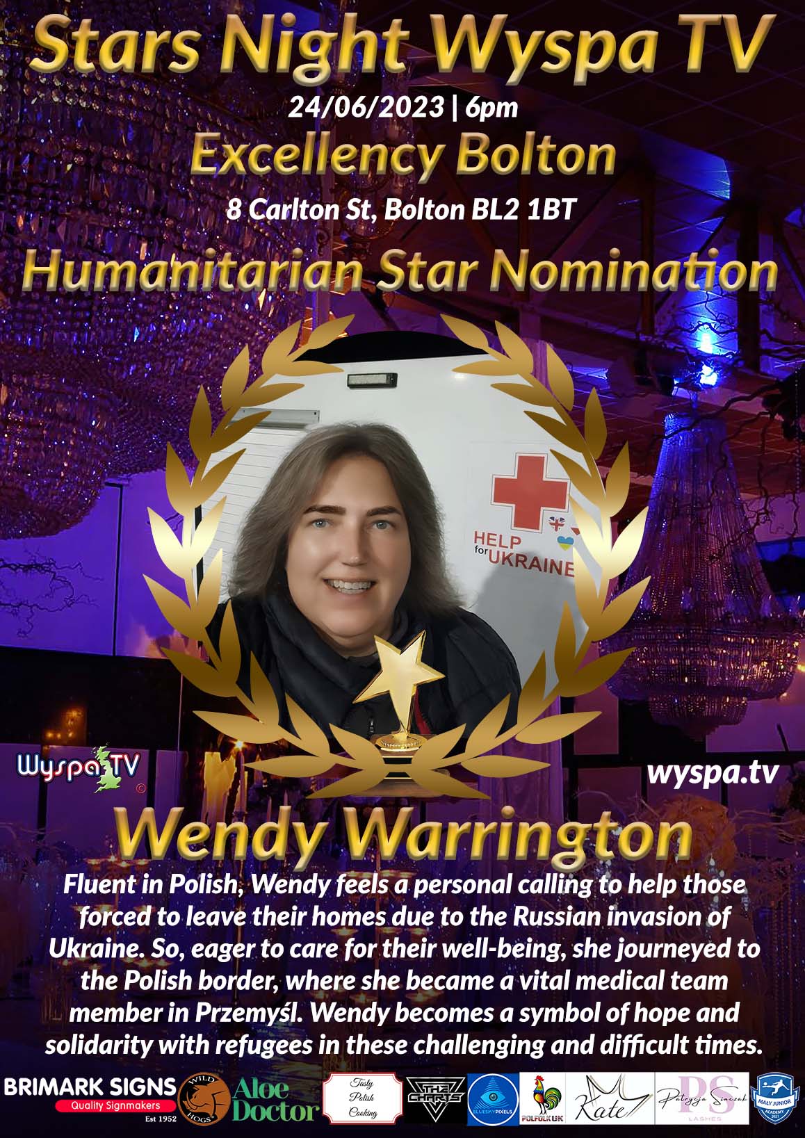 Another nomination in the "HUMANITARIAN STAR" category for the prestigious STARS NIGHT WYPA TV 2023 award is addressed to a brave woman. Thanks to her dedication and unyielding determination, she becomes a symbol of hope and solidarity among Ukrainian refugees.