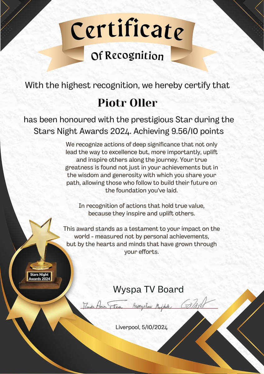 Piotr Oller deserves special recognition for his incredible charitable work and unwavering commitment to helping those in need. His work for children in Cambodia, along with numerous other efforts, brings hope and real assistance to those who need it most. Piotr stands out for his dedication, passion, and relentless commitment, making him a true hero of our times.