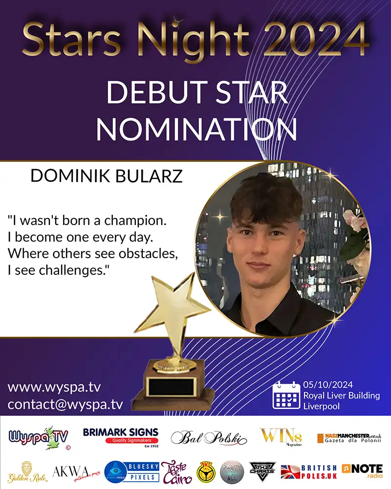 Dominik Bularz, a young sports phenomenon, has been nominated for the prestigious STARS NIGHT 2024 award in the DEBUT STAR category. At 18 years old, Dominik has emerged as an extraordinary talent in the kickboxing world, gaining recognition as the youngest participant in this category. His remarkable passion for the sport sets him apart from his peers, making him not only a multiple-time champion but also an inspiration for young athletes worldwide.