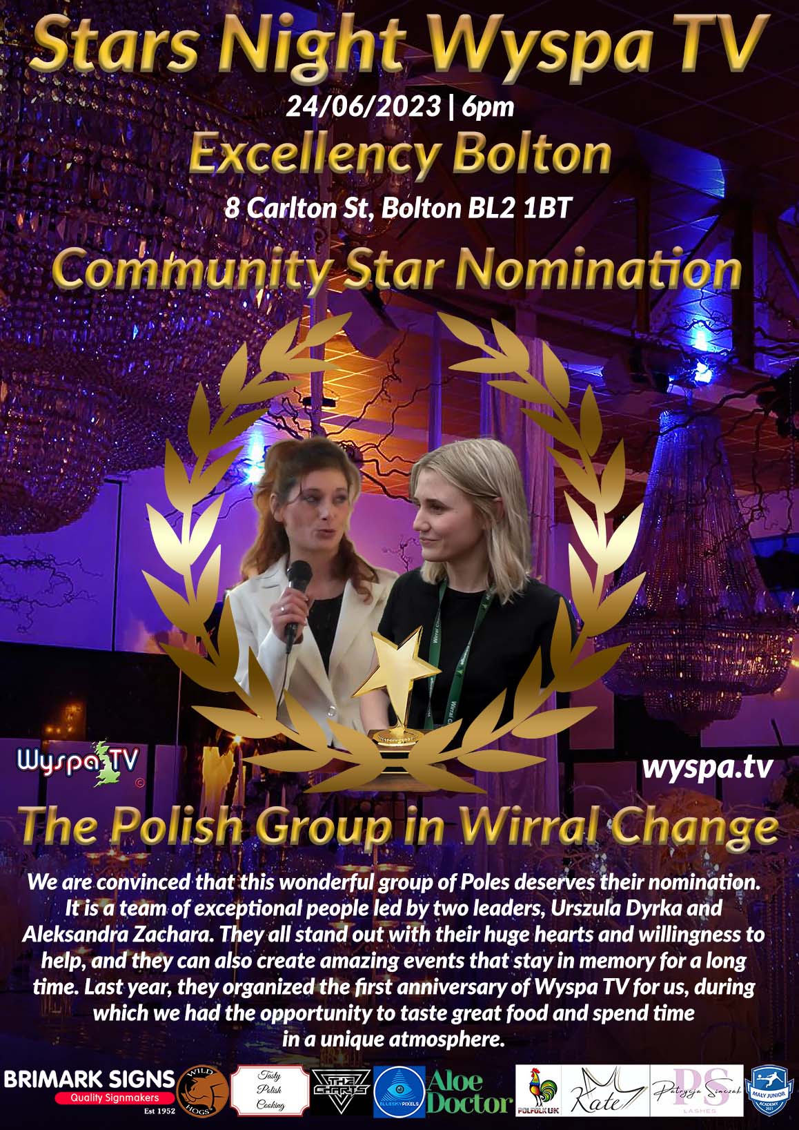 It is the last nomination for the prestigious STARS NIGHT WYSPA TV award in the "COMMUNITY STAR" category. We are convinced that this wonderful group of Poles deserves their nomination. It is a team of exceptional people led by two leaders, Urszula Dyrka and Aleksandra Zachara. They all stand out with their huge hearts and willingness to help, and they can also create amazing events that stay in memory for a long time.
