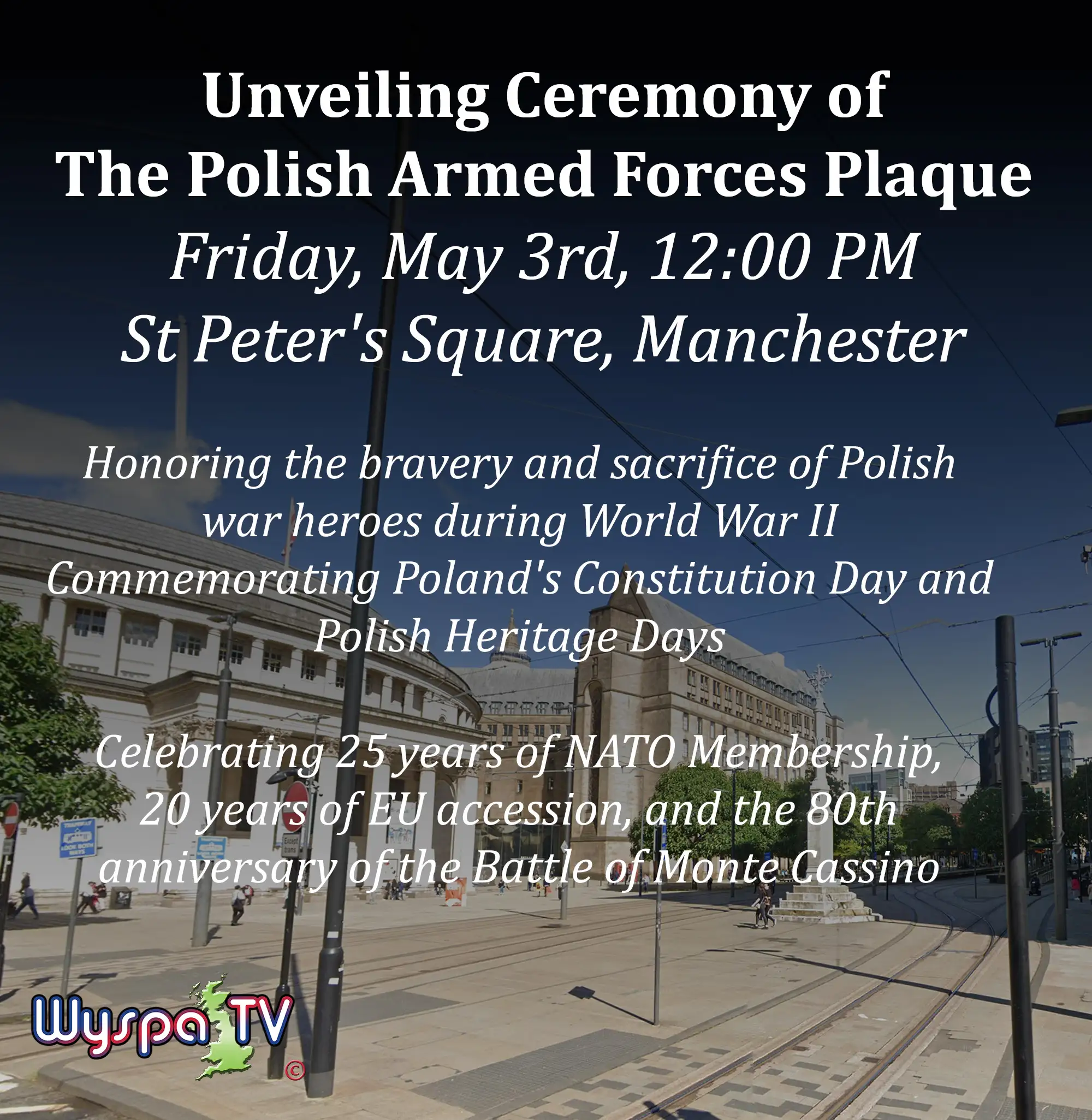 W Manchester, na historycznym placu św. Piotra, w dniu 3 maja o godzinie 12:00 odbędzie się wyjątkowe wydarzenie, które ma na celu uhonorowanie bohaterskiego wkładu Polaków w czasie II Wojny Światowej. Dzięki inicjatywie Konsulatu Generalnego Rzeczypospolitej Polskiej w Manchester i wsparciu miasta, społeczność lokalna oraz Polonia zjednoczą się, by odsłonić Tablicę Sił Zbrojnych Polski.