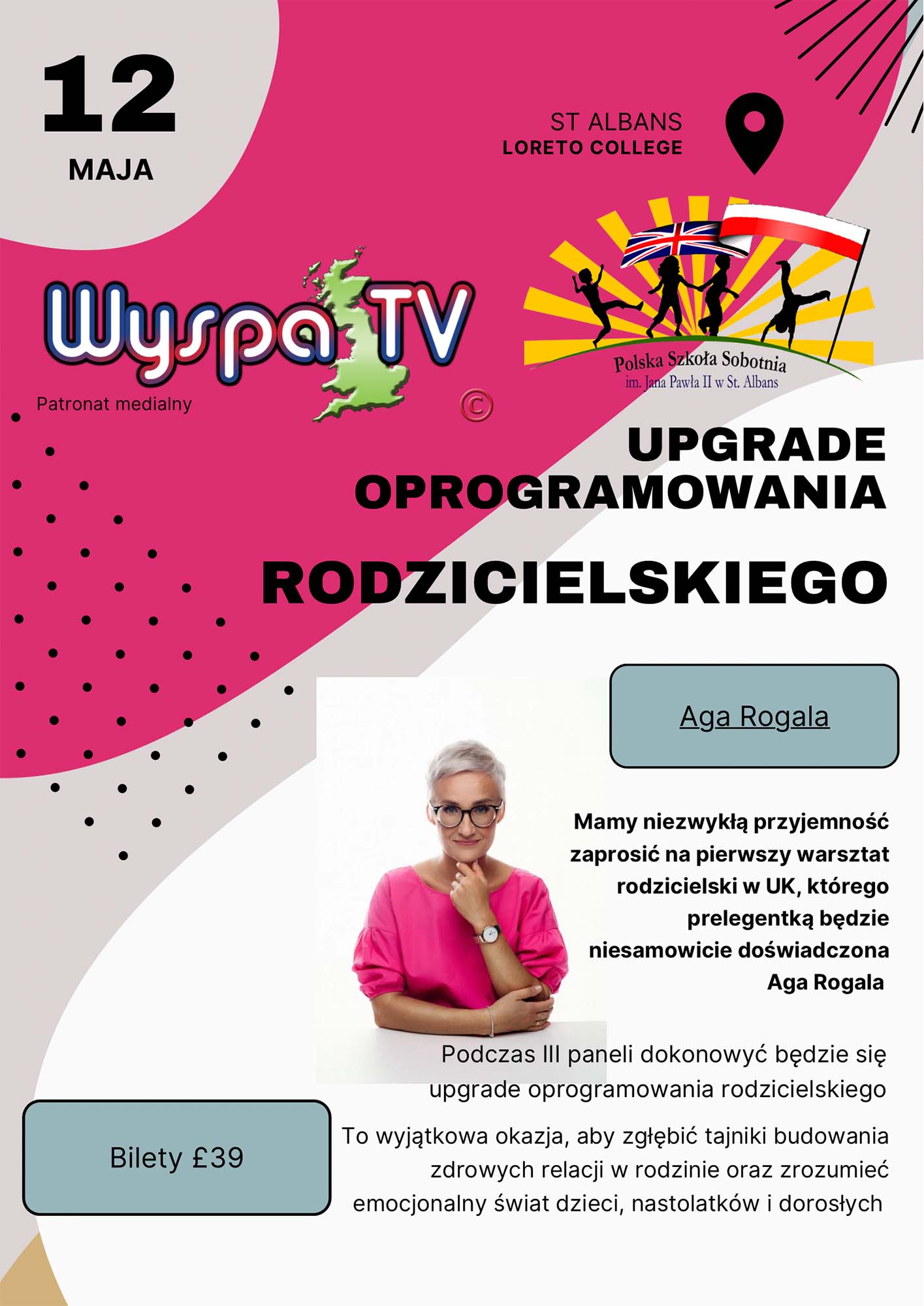 Polska Szkoła Sobotnia im. Jana Pawła II w St Albans z radością zaprasza na pierwsze zagraniczne warsztaty prowadzone przez Agę Rogala, które odbędą się w niedzielę, 12 maja, w Loreto College w St Albans. Aga Rogala jest doświadczoną terapeutką rodziców, pedagogiem oraz twórcą podcastów i autorką książki „Poukładaj to sobie w głowie”, podzieli się swoją wiedzą na temat budowania zdrowych relacji w rodzinie oraz zrozumienia emocjonalnego świata dzieci, nastolatków i dorosłych.